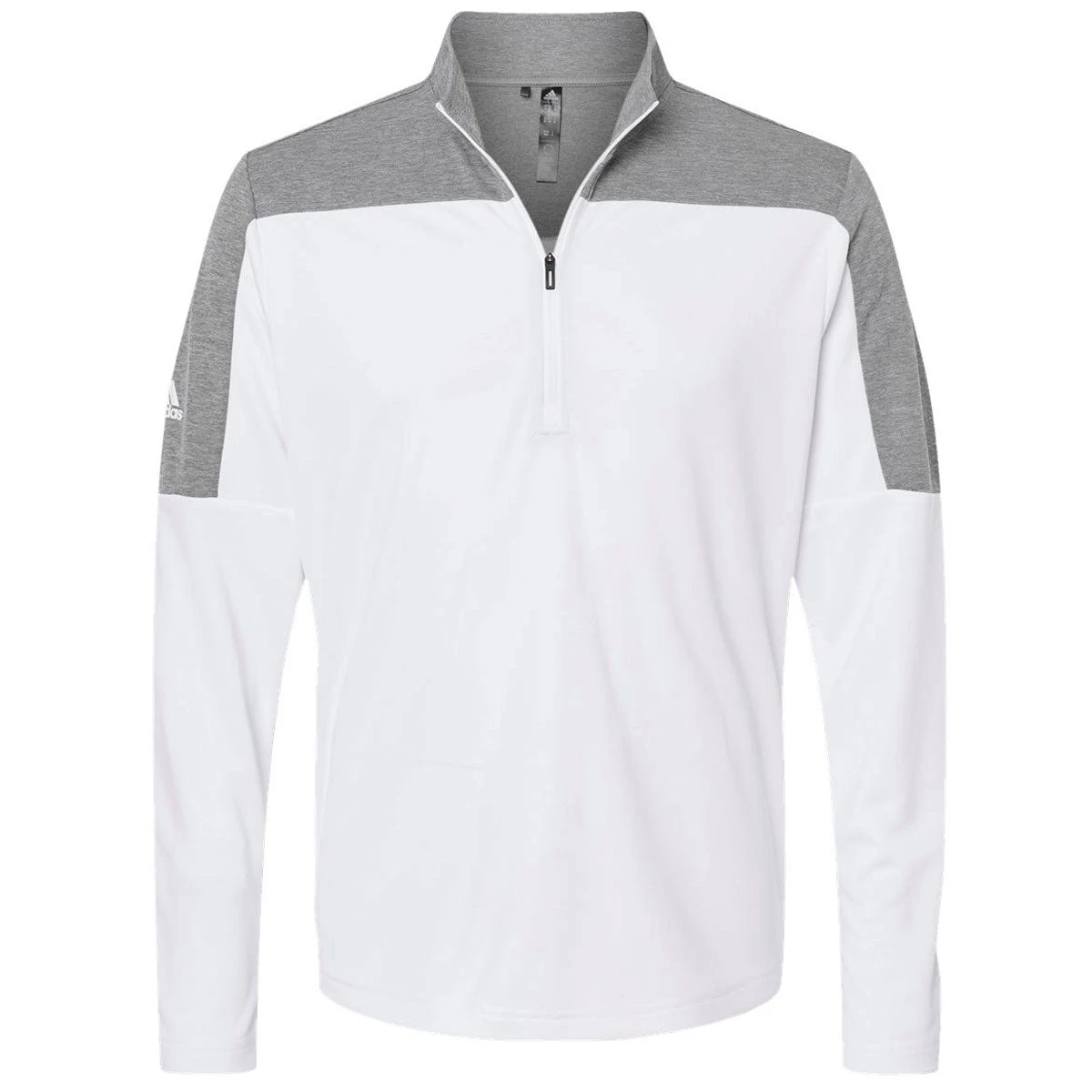 The adidas Men’s White/Grey Three Melange Lightweight Quarter Zip Pullover will show off your company’s custom logo or design like no other hooded sweatshirt can. The two-toned design will set your team apart in the best way possible. Special moisture-wicking fabric makes it great for athletes or anyone with an active lifestyle.