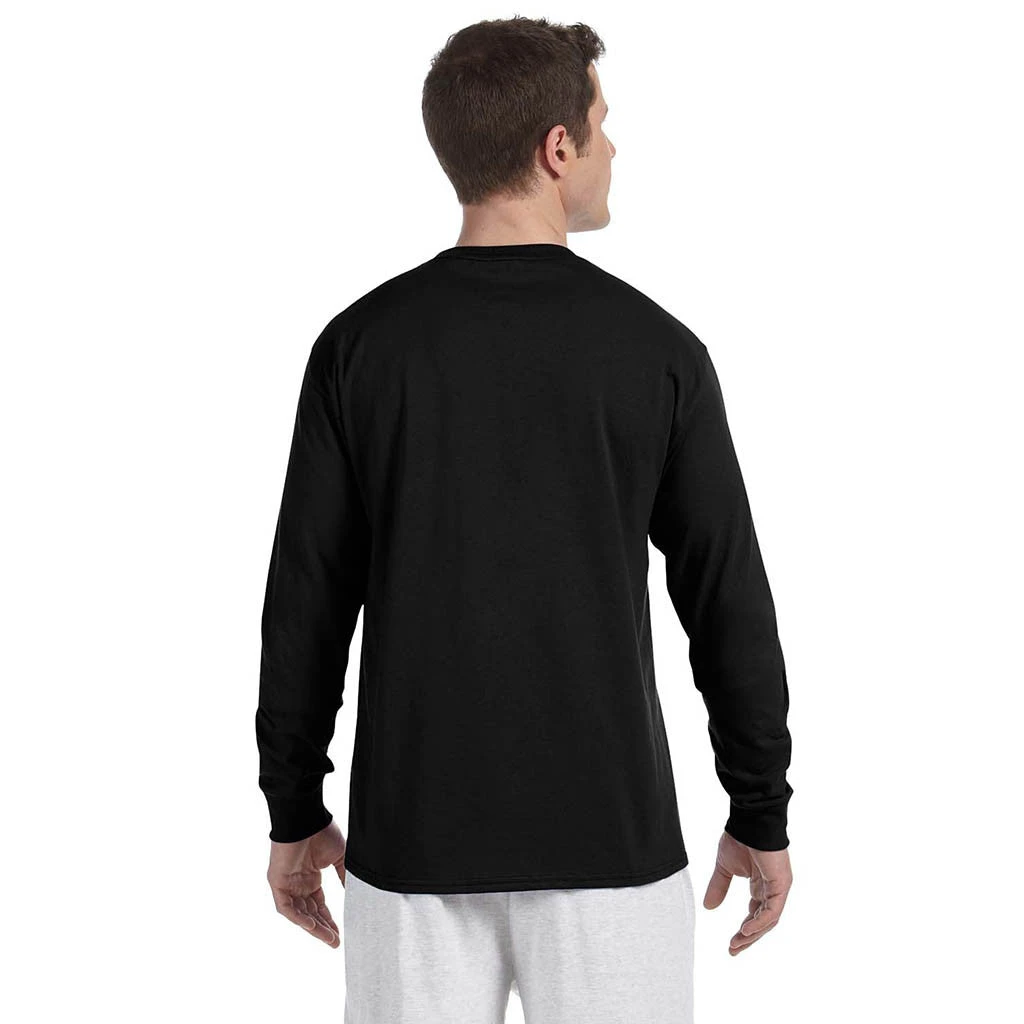 There’s a reason they call it Champion–and it’s not just the brand name. Champion has been a trusted name in sportswear thanks to classic style, quality craftsmanship, and plain being one of the best around. Featured here is the Champion Men’s 5.2 oz Black L/S Tagless T-Shirt. This is a timeless design that will never go out of style. The Champion Men’s 5.2 oz Black L/S Tagless T-Shirt is great for not just playing sports, but it’s wonderful for everyday wear as well. Extremely comfortable, the tagless aspect allows for no neck irritation. It is made of 100% open-end cotton, has ribbed cuffs, a rubbed collar and there is a logo above the left cuff.