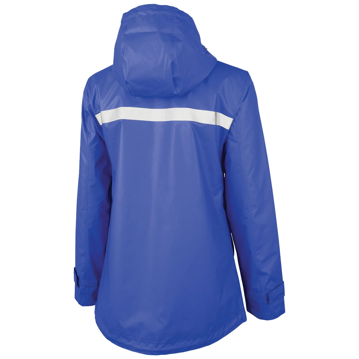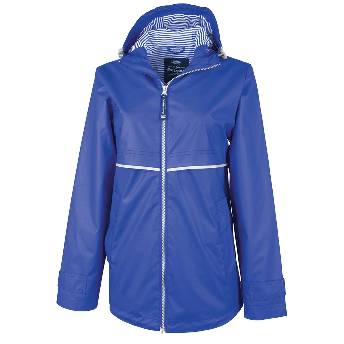 A custom embroidered Charles River Women’s Royal/Stripe New Englander Rain Jacket with Print Lining offers the perfect companion piece to the New Englander Tote in six bold color combinations. Great for those golf events that run into a bit of wet weather or outdoor recruiting events that need to keep going no matter the weather. Made of 100% polyester polyurethane with a printed plaid taffeta lining, this rain jacket keeps you dry while looking like you are runway ready. A full zip closure with full length wind flaps mean full protection from the elements in a rain jacket that any company logo would be proud to be stitched on.