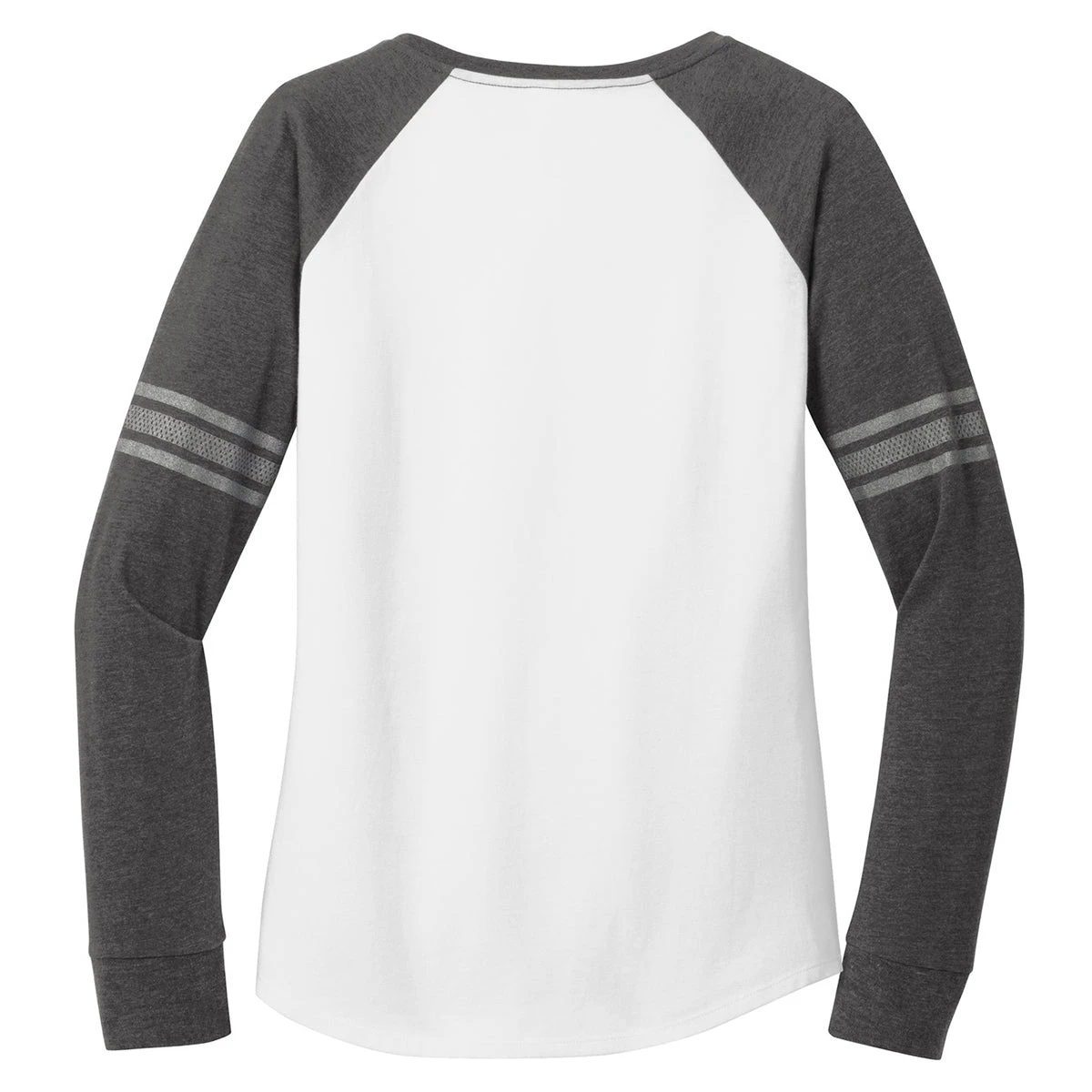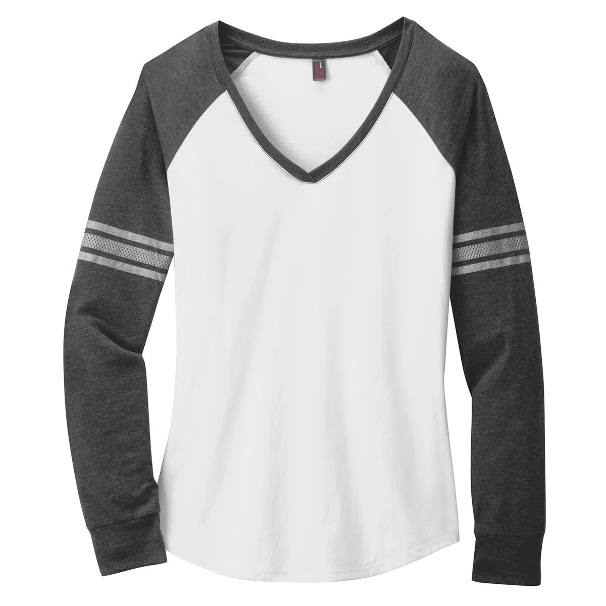 Hit a fashion home run by wearing the embroidered District Women’s White/Heathered Charcoal/Silver Game Long Sleeve V-Neck Tee. Put on the crossover v-neck shirt as an only layer for a softball game or as the first layer to protect you against cold temperatures. The elegant curved hem and solid print stripes on the sleeves separate the long sleeve tee from the corporate apparel competition. Blended ring spun combed cotton and rugged polyester ensures you enjoy the stylish tee for years to come. Add a custom logo on the large imprint area to get the word out about your company in the community.