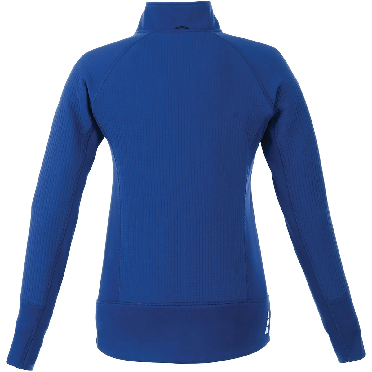 Enhance your wardrobe with the Elevate Women’s Metro Blue Panorama Hybrid Knit Jacket with full frontal zipper and a water repellant finish. We know you are busy, so choose employee apparel or corporate gifts that you can also enjoy. The running sleeve cuff with hand warmer and thumb exit mean you can use your phone and keep moving forward even in cold weather. The cover stitch detail mirrors the quality in the entire piece. Available in four bold colors, custom order several with your corporate embroidery to help unite your company team or encourage cooperation. Those lucky enough to wear one of your custom created knit jackets will know the quality product you provide!