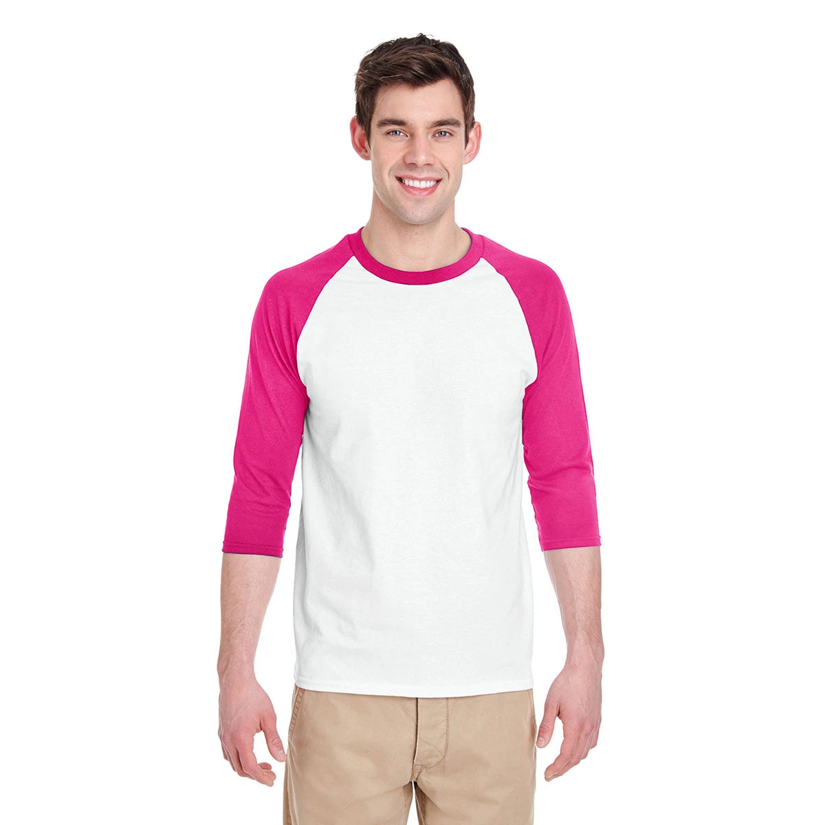 Put a little swag into the way your company performs in the field of work, as well as on a softball field, when you give away the custom printed Gildan Unisex White/Heliconia 5.3 oz. 3/4-Raglan Sleeve T-Shirt. Single needle stitching at the back of the neck allows the fabric to shine. With the fashionable fabric attracting interest from everyone you meet, display the screen printed logo added on the large imprint area of the chest to gain more loyal customers. Logoed company apparel represents an effective way to connect with potential customers, without busting the annual marketing budget.