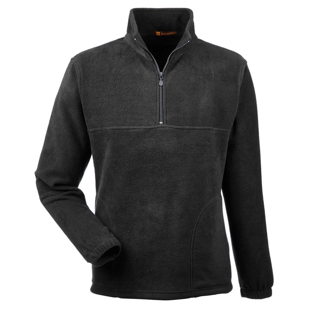 Highly breathable medium weight fleece makes the Harriton Men’s Black 8 oz. Quarter-Zip Fleece Pullover a must have for your corporate apparel collection. The non-pill finish on the surface ensures the tightly woven fabric never unravels. Non-roll elastic cuffs allow you to move your arms freely to increase productivity during outdoor work projects. On the seam pockets offer you storage space for electronic devices, such as an iPod and Smartphone. The stylish front yoke and dyed-to-match zippers will attract the interest of potential customers. Attach a custom logo that lets potential customers know about your company.