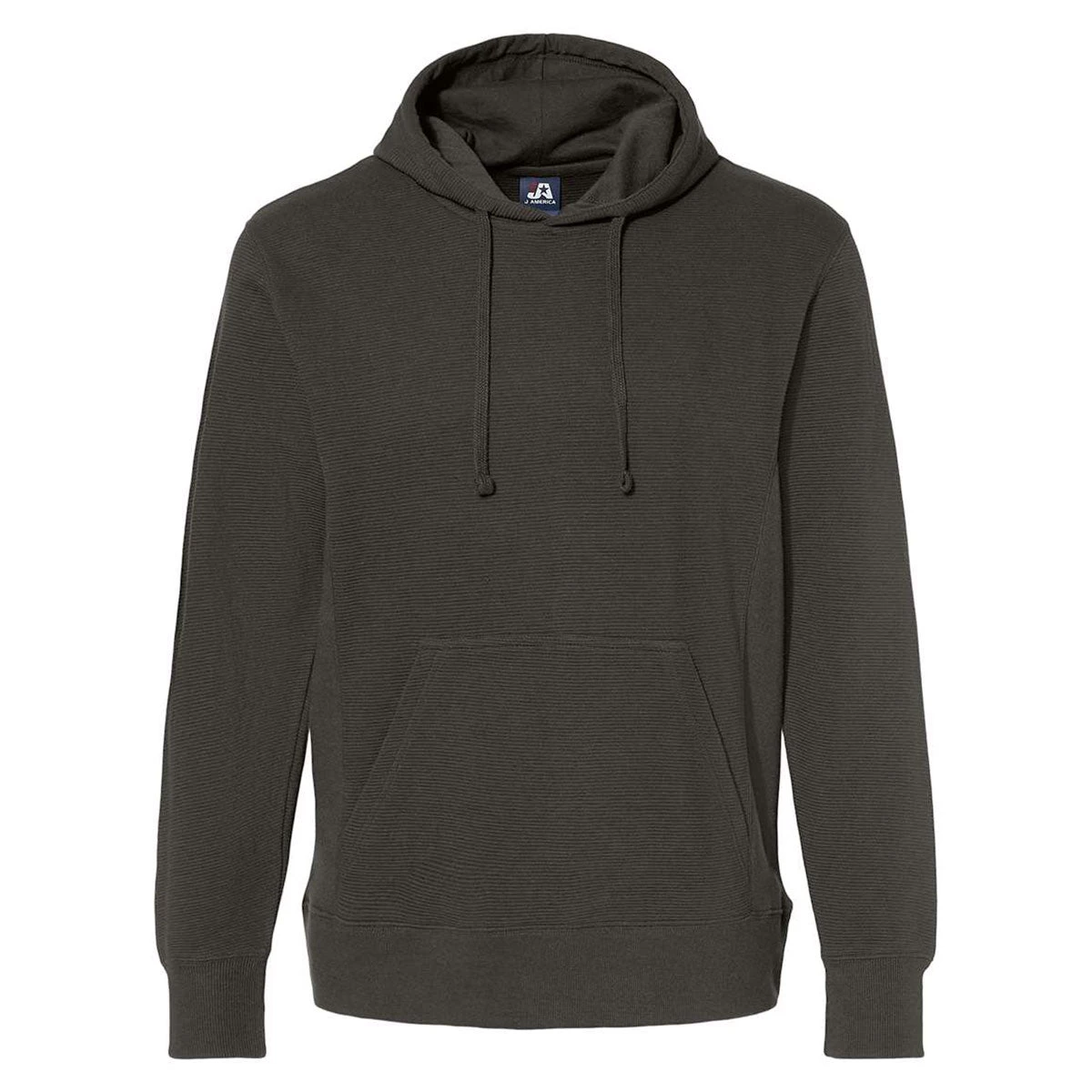 Add your screen print to the J. America Men’s Black Ripple Fleece Hooded Sweatshirt for a look you create on the cotton polyester knit ottoman fleece. The unique horizontal stripe texture throughout the fabric adds flair to an otherwise simple hooded sweatshirt that can be used as a custom gift or as an addition to your logoed apparel line. Try a company logo to give as employee gifts or to use as part of a uniform for easy recognition of employees. The attached hood has a drawstring for perfect fit and a set-in pocket keeps your necessities protected no matter what your day holds.