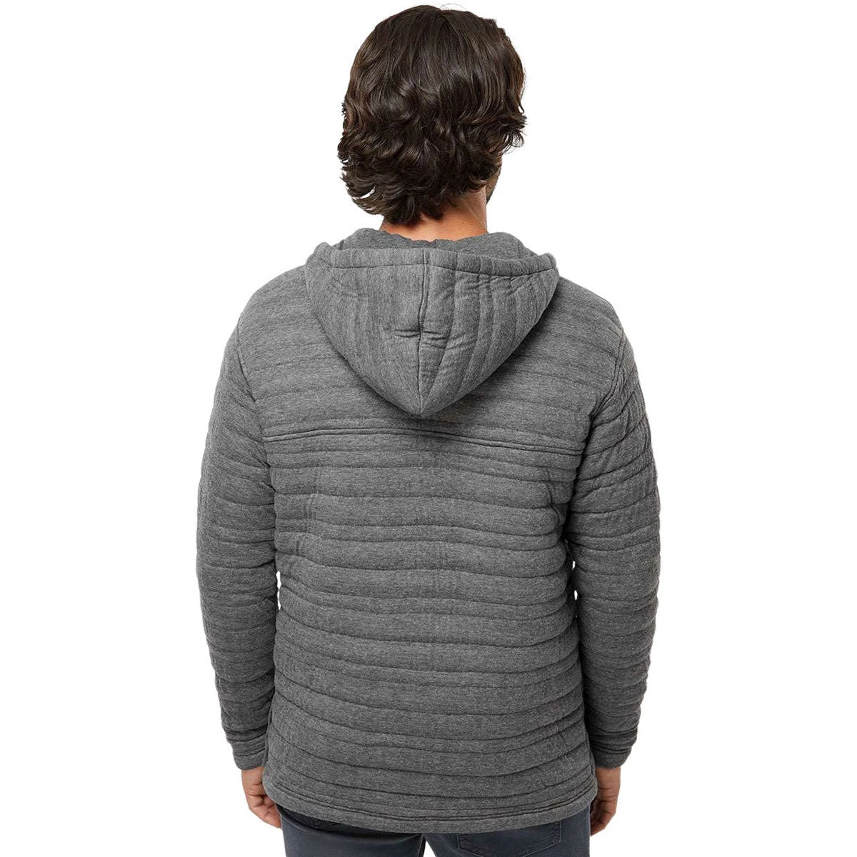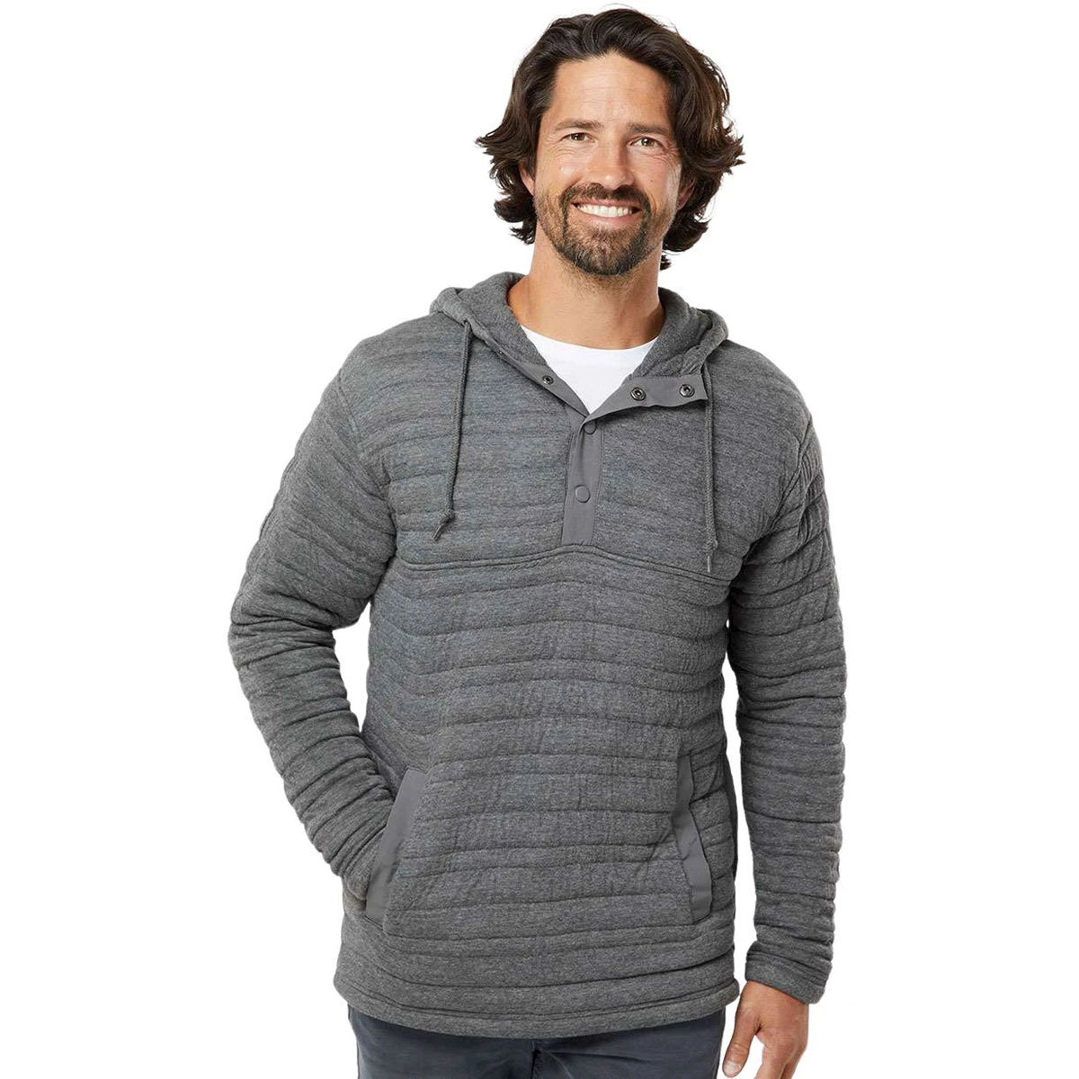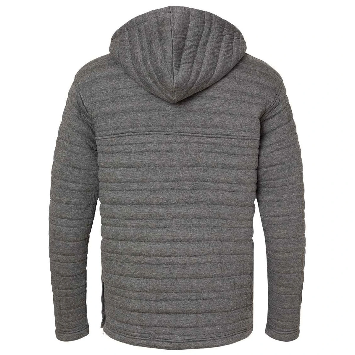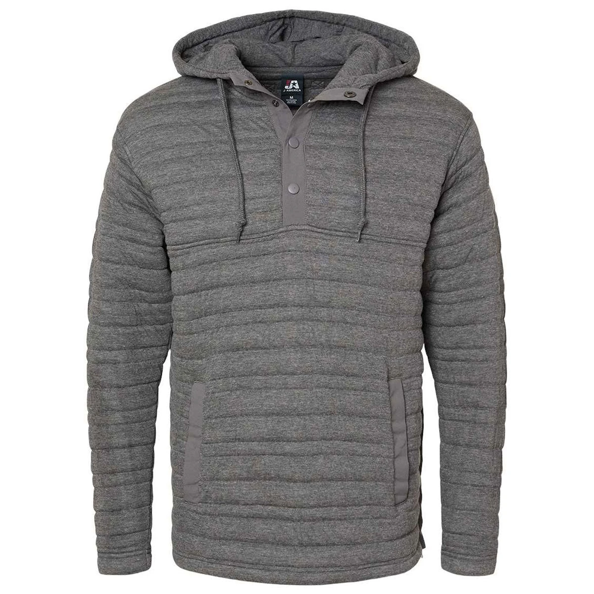 The J. America Men’s Charcoal Heather Horizon Quilted Anorak Hooded Pullover features a stylish quilted fabric that will perfectly highlight your company’s custom logo or design. Great for students, athletes, and professionals alike, it features on-trend touches like snaps at the neckline and zippered accents on the side seams.Â