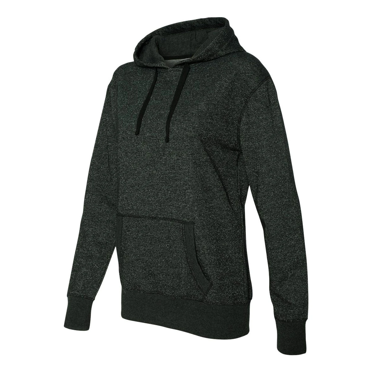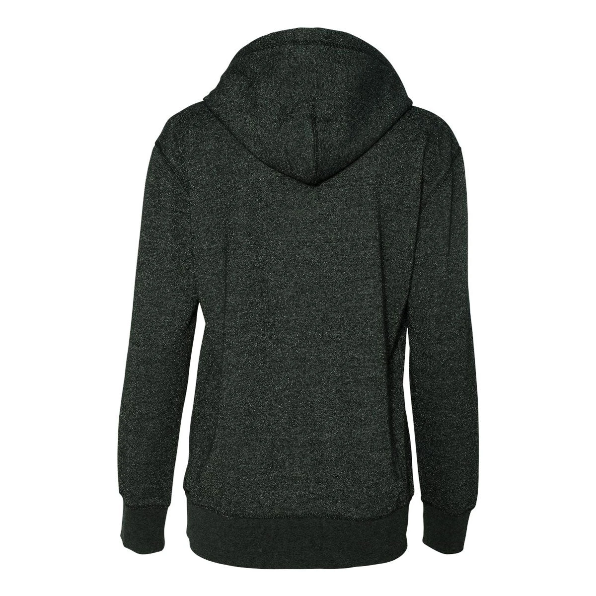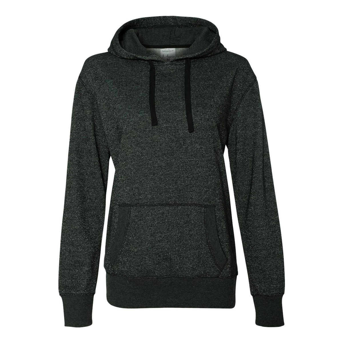 Attach a custom logo on the embroidered J. America Women’s Black/Silver Glitter French Terry Hooded Pullover to turn customer prospects into lifelong patrons of your company. With logoed corporate apparel, you create a cost effective platform for getting the word out about your products and services. Tiny silver glitter pieces embedded into the cotton and polyester fabric sparkle under the bright lights of a business conference or a nightclub dance floor. Rugged polyester resists the types of rips and tears that change athletic garments into worthless dust rags. The two by one rib waist complements the design of the dyed-to-match draw cord.