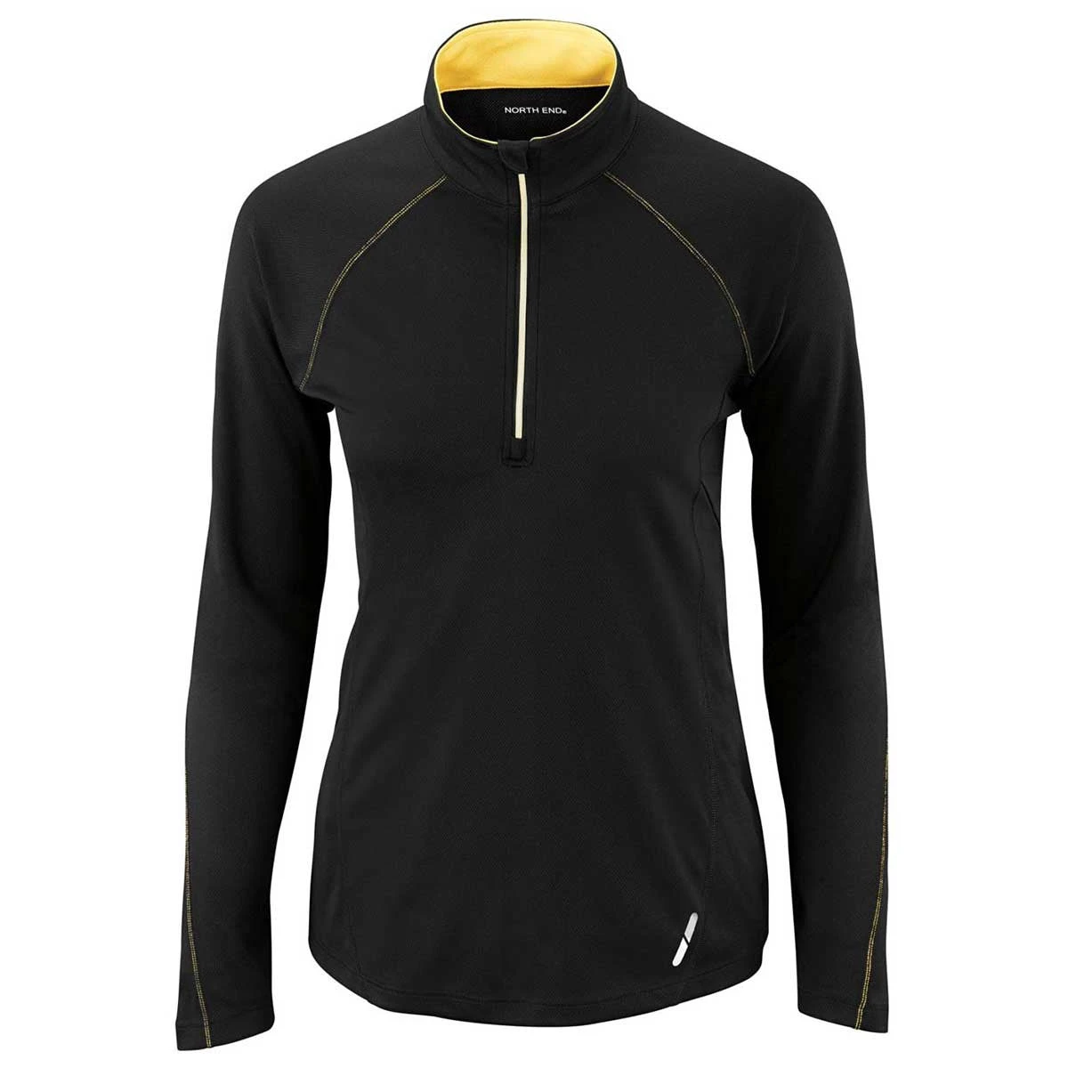 The North End Women’s Black/Campus Gold Radar Half-Zip Performance Long-Sleeve Top includes an inside placket and chin guard that complements the stylish rolled collar. Wear this quarter zip to casual company outings and civic events, but make sure to place your corporate logo on the large chest imprint area. Moisture wicking technology keeps you comfortable during the most intense workouts. Rugged polyester interlock resists the types of rips and tears that render other quarter zips obsolete. The center front semi-automatic lock zipper includes a rubber pull tab for convenience. Several storage pockets allow you to have instant access to your electronic devices.
